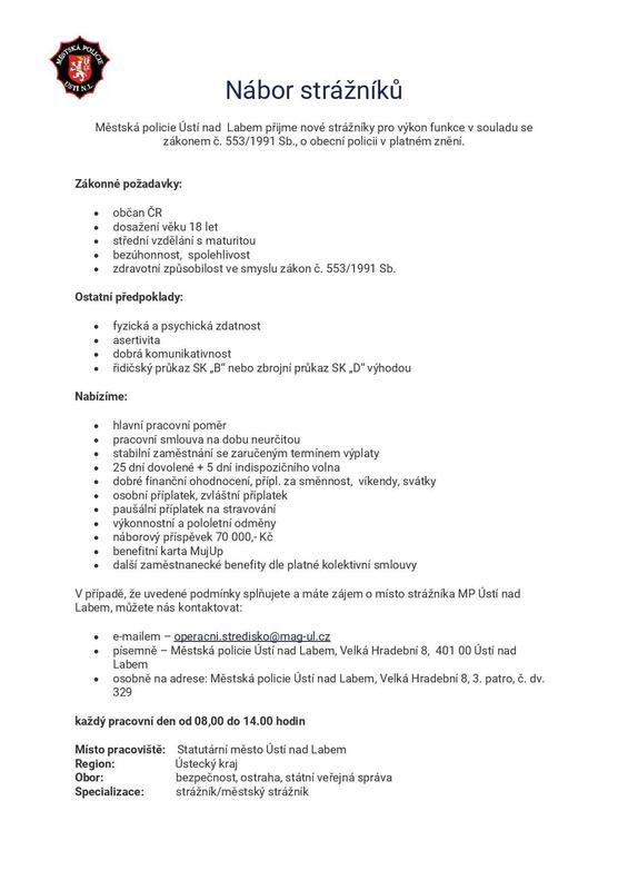Městská policie Ústí nad Labem přijme nové strážníky pro výkon funkce v souladu se zákonem č. 553/1991 Sb., o obecní policii v platném znění.