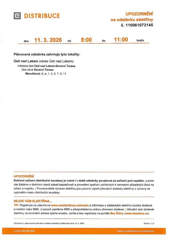 Home > Náš obvod > Aktuality > Plánovaná odstávka elektřiny 11.3.2026 Plánovaná odstávka elektřiny 11.3.2026 10.3.2026 Plánovaná odstávka ulice Meruňková: 1,3,5,7,9,11 Zpět